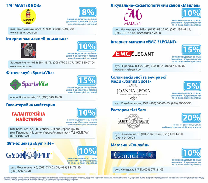 Отримуйте більше приємних послуг та заощаджуйте на покупках з «EVERCARD»! Зустрічайте нових ПАРТНЕРІВ «Клубу ЕВЕРЕСТ»: