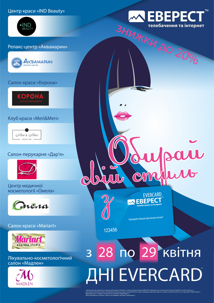 Плануєте побачення чи важливу подію? Або бажаєте просто змінити імідж? Виглядати на всі 100% та ще й отримати приємну знижку* вам допоможе дисконтна карта EVERCARD від компанії «Еверест».