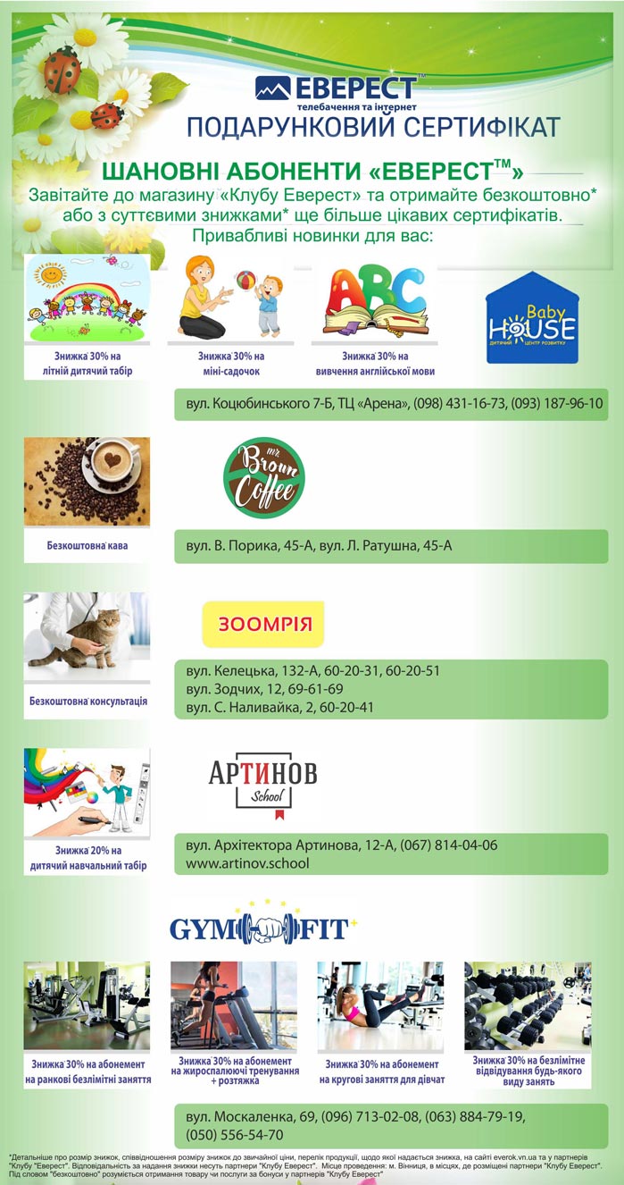 Завітайте до магазину «Клубу Еверест» та отримайте безкоштовно* або з суттєвими знижками* ще більше цікавих сертифікатів.