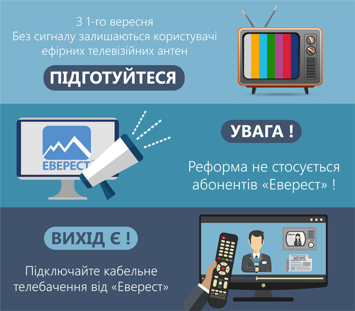 В связи с участившимися вопросами в адрес компании, мы официально сообщаем: при отключении эфирного аналогового тв, без сигнала останутся лишь те зрители, которые используют для приема эфирные антенны (комнатные или уличные). Все абоненты компании Эверест, как и раньше, смогут наслаждаться любимыми каналами!